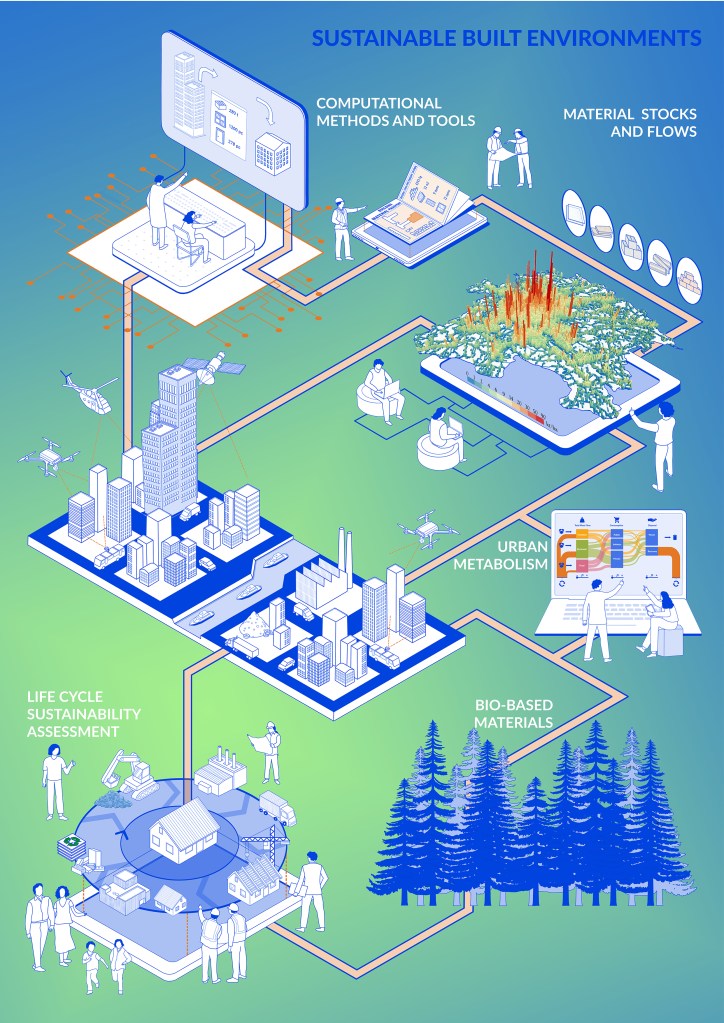 The Sustainable Built Environments Research Area focuses on developing methods, tools, and strategies to enhance the sustainability performance of the built environment. Our research encompasses everything from construction materials and building products to entire buildings, neighbourhoods, cities, and regions. We build upon and advance the foundations of sustainability science, while also engaging in applied research with a diverse range of stakeholders, including material manufacturers, designers, planners, and citizens.